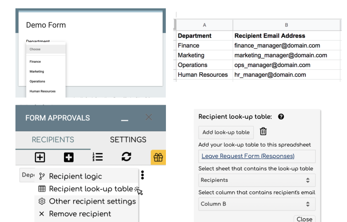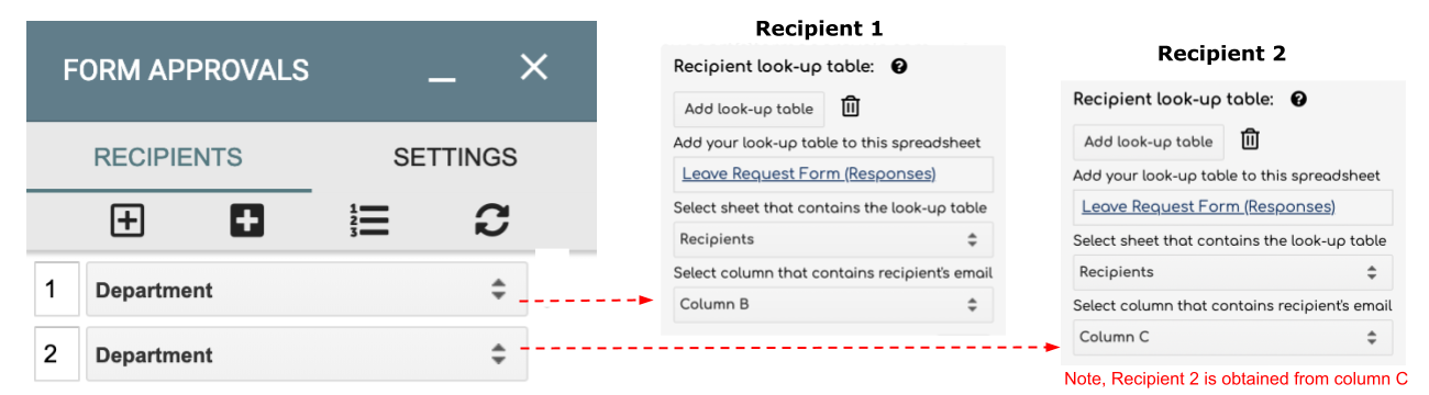 Tip 2: If you have an approval hierarchy that is determined based on the same form question you can use the same look-up table for additional recipients. In this case, you would add additional recipient email addresses in columns C, D, etc. For example, if you want two recipients, repeat steps 4 to 12 (above) but instead of entering the recipient email address in column B, enter it into column C. Refer to the images below.