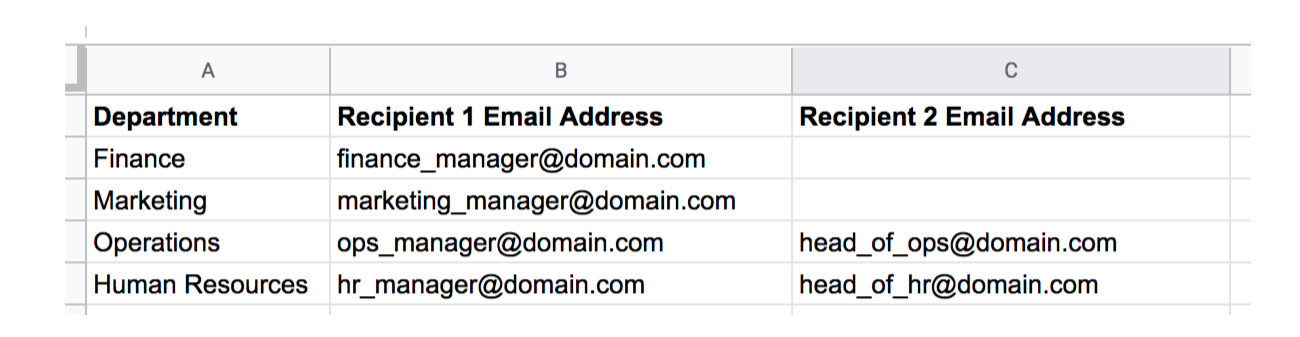 Sometimes you may capture other information (e.g Department name) and you want to route to recipient(s) based on that information. This option allows you to set up a spreadsheet to map information captured to the recipient's email address.Steps to add the recipient: